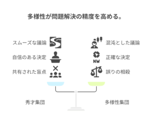 複雑な問題解決タスクにおいて、「能力は高いが似たような背景を持つ集団」と「能力はやや劣るが多様な背景を持つ集団」を比較しました。常識的に考えれば、前者の方が良い成果を出すはずです。しかし、結果は逆でした。多様性のある集団の方が、一貫して優れた問題解決能力を示したのです。