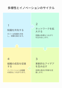 情報や知識を積極的に共有する「与える人(ギバー)」の周りには、自然と多様な情報が集まってくるというのです。与えることで信頼関係が生まれ、異なる部署や背景を持つ人々とのネットワークが広がります。その結果、革新的なアイデアが生まれる確率が高まるのです。