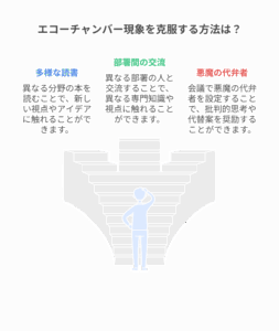 この罠を克服するには、意識的な仕組みづくりが必要です。例えば、月に一度は自分と異なる分野の本を読む、異なる部署の人とランチをする機会を設ける、会議では必ず「悪魔の代弁者」役を設定するなど、システムとして多様な意見に触れる機会を作ることが重要です。