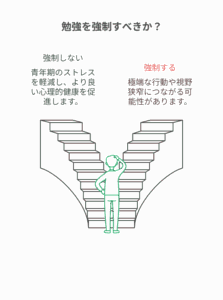 青年期に強いストレスを受け続けると、心理的視野が極端に狭くなります。この状態では、物事を冷静に判断する能力が低下し、社会に対する怒りや過激な行動に走る危険性が高まります。特に勉強に関する強制は、将来への希望を奪い、「今すぐこの苦痛から逃れたい」という短絡的な思考を生み出します。